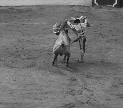 À mi-chemin entre les arènes du Puerto de Santa María et le café nommé « Aqui Te Espero », on ne sait quelle peña de thanatopracteurs a fait ériger une statue du défunt, tragiquement défunt matador Paquirri, mort par corne de taureau à Pozoblanco, en train de réaliser la passe dite larga afarolada de rodillas, selon toute vraisemblance a porta gayola, puisqu’il faut bien donner un nom à chaque chose, et avec toute la précision possible, aux débits de boissons comme aux passes de capes, aux types qui font le taureau au naturel comme, paraît-il, aux taureaux. Si on ne donne pas un nom à chaque chose, et avec toute la précision possible, on finit pas s’emmêler les pinceaux. Forcément.